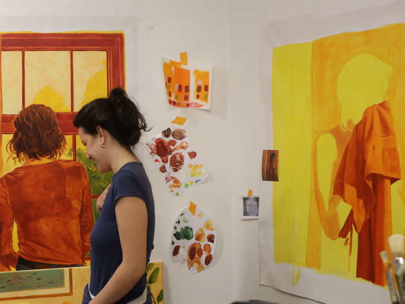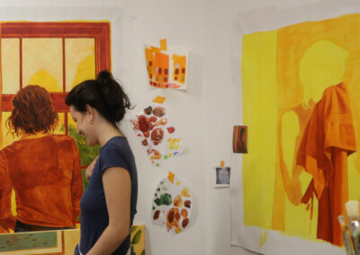 Sa pratique picturale s’ancre dans la mémoire collective et cherche à révéler l’universalité des émotions humaines. À travers la représentation du corps, elle explore les gestes simples, les attitudes et les postures ordinaires, ces instants de loisir, de calme ou de quotidien qui racontent une expérience humaine commune. En se concentrant sur l’ordinaire et l’intime, elle tente de faire surgir la profondeur poétique de ces scènes et de préserver ces sensations éphémères. La lumière et la couleur sont au cœur de son travail, envisagées comme des matières sensibles dont les intensités vives cherchent à éveiller des sensations corporelles.